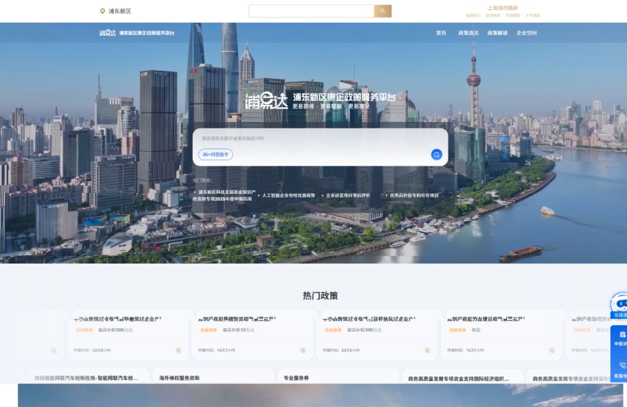 据悉,“浦易达”是政策全量归集、全程线上办理、市区兑付贯通、垂类模型应用的综合性平台,实现了政策查询、申报、审批、兑付的全流程线上闭环,企业无需重复注册登录,仅需通过“https://pyd.pudong.gov.cn”一个端口即可通办浦东全量惠企政策。截至目前,平台已汇集约20家政策制定部门的260余条惠企政策、服务企业超1万次,兑付金额近2亿元,形成了“企业找政策”到“政策找企业”的服务新模式。